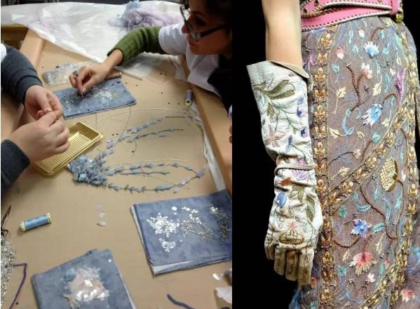 大工業時代,機器刺繡提高了產量和質量,但手工刺繡是機器永遠代替不了的。手繡的紋理、繡線搭配都會更加生動靈活,而機繡作品通常會顯得滯澀、呆板。目前,國際上高級訂制服依然堅持手工刺繡以彰顯工藝價值。