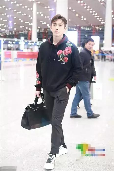 93年183的張彬彬,穿著刺繡印花衣,比起楊洋那個寬松的休閑,張彬彬選擇黑色系衛衣款,配上標準黑色鉛筆褲,小白鞋,搭配典型的 背包,這個風格,這個打扮,細節都到位,連小白鞋的鞋帶都能搭配黑色,顯示整個協調,這個真的要贊一個,不愧是楊冪旗下的藝人,這搭配有條有理,細節都不放過,真的很贊!