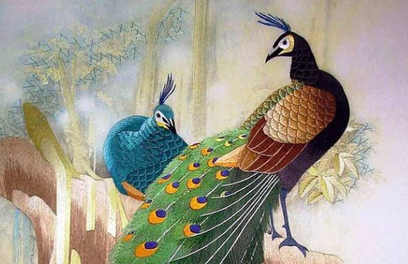 “粵繡”,遠(yuǎn)看非常醒目,近看又精細(xì)非常。以孔雀羽毛扭績(jī)成線(xiàn)縷,以馬尾纏絨為勒線(xiàn)等。清中葉是廣繡出口的全盛時(shí)期,大幅的繡畫(huà)納稅也要白銀1.2兩,可知價(jià)值不菲。當(dāng)時(shí)的廣繡作品布局章法已中西合璧,用色濃艷且非常光影變化。今故宮仍保存著當(dāng)時(shí)廣繡掛屏可證其藝術(shù)高超。