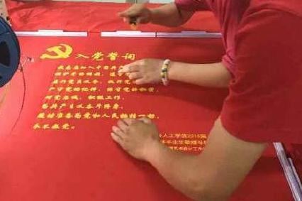 在鮮紅的布料上刺繡著金黃色的入黨誓詞,字顯得格外耀眼,精美漂亮。在工人的忙碌下,一幅幅紅色的入黨誓詞成品就出來了。
