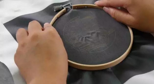 把描完稿子的繡布裝在繡繃上,注意一定要繃緊繡布。