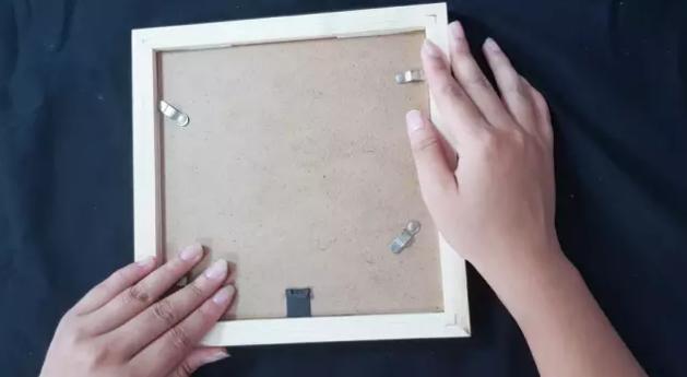 把相框后的背板蓋上,將四周的鐵片卡進相框中間的縫隙處,固定。