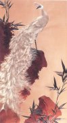 繡面以白孔雀為主體,紅崖、墨竹相襯托,運(yùn)用散套、斜纏、滾針、擻和針多種針?lè)ù汤C,不僅使白孔雀的每一根潔白、美麗的羽毛如受微風(fēng)拂動(dòng),而且光澤豐潤(rùn),富于質(zhì)感,每一根纖細(xì)的羽毛與羽絨都處理的一絲不茍,表現(xiàn)出針?lè)ǖ膰?yán)謹(jǐn)和細(xì)膩。孔雀的眼睛,更用線條極短的旋針繡,使其目光閃爍,極為傳神。整個(gè)繡面光潔勻稱,生動(dòng)活潑,宛如一只真的白孔雀亭立于峻秀的紅崖上,背依墨竹,昂首向陽(yáng),全身放射出銀白色的光輝,高雅文靜,栩栩如生。