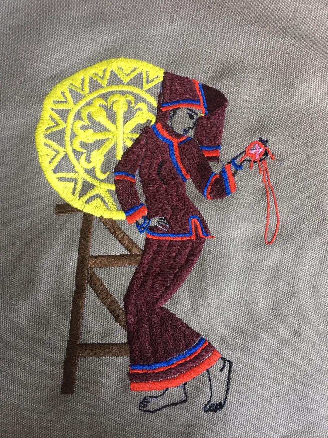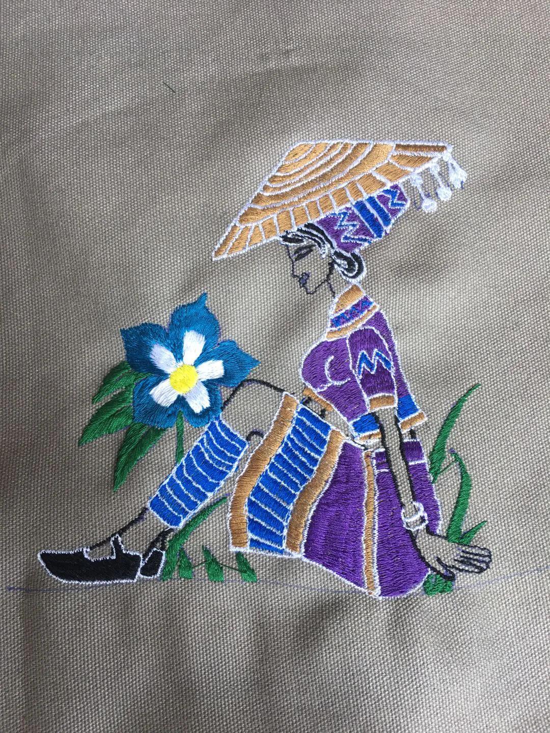 新手手推繡作業,手推繡高手進來指點一下,這是一位剛自學手推繡一個月的新手上傳的手推繡作品,這位網友通過看視頻即初步掌握了手推繡技巧。不想單調秀朵花。用剩下的布做了個錢包。根據朋友給的下圖秀在包上。壯族少女在篝火宴準備拋繡球。