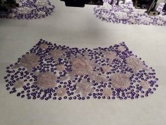 什么是珠片繡?珠片繡珠片繡又稱珠片刺繡、亮片繡、亮片刺繡。是指將各種顏色的耐高溫PET材料的環(huán)保片材,用沖片機(jī)器沖成形狀不一規(guī)格大小相同的珠片帶, 然后在裝有珠片繡裝置的刺繡機(jī)上進(jìn)行刺繡。珠片繡產(chǎn)品是由若干單個珠片和針跡構(gòu)成的。珠片繡工作時,送片裝置將長長的、如膠帶狀的珠片帶,移動到織物上,接著切片裝置的切片刀,將一個一個珠片切斷,同時繡針在珠片的中心位置(珠片孔)刺進(jìn)織物,將珠片位置固定不動,再以此為中心沿珠片外圈繡上單針或雙針、三針,將珠片包裹住,使其緊貼在織物上。在珠片繡裝置和繡針重復(fù)運(yùn)動,和繡框移動配合下,一款閃閃發(fā)光的珠片繡就完成了。